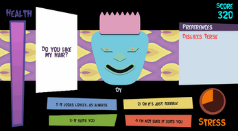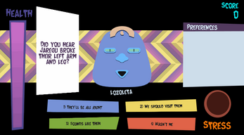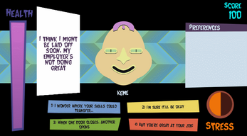 Keep It Together is a simple game about learning how to interact with different people, social anxiety, and trying to stay composed under stress. Talk to people and try not to say things that upset them, because a bad response will stress you out - too much stress and you'll be playing finger twister on your keyboard just to keep going!
